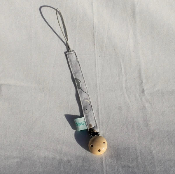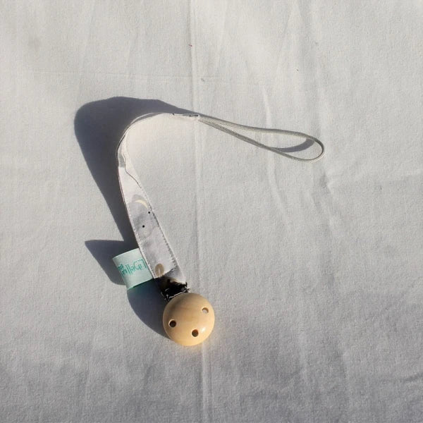 Cette attache tétine est fabriquée à partir de coton et de bois d’hêtre naturel.