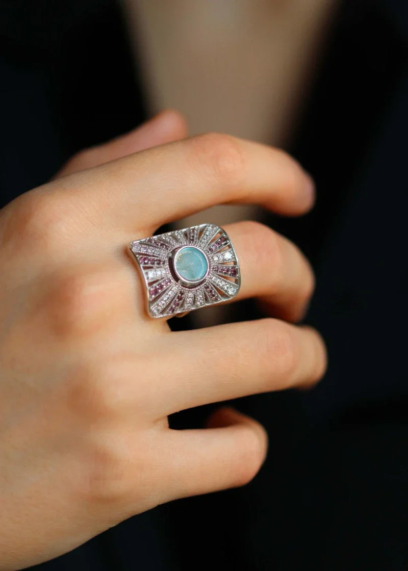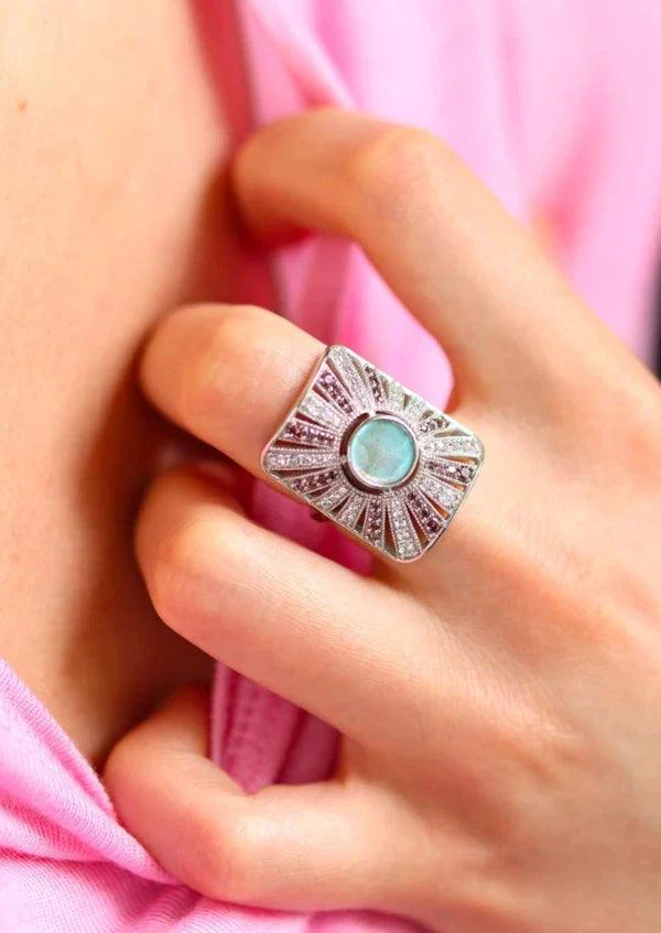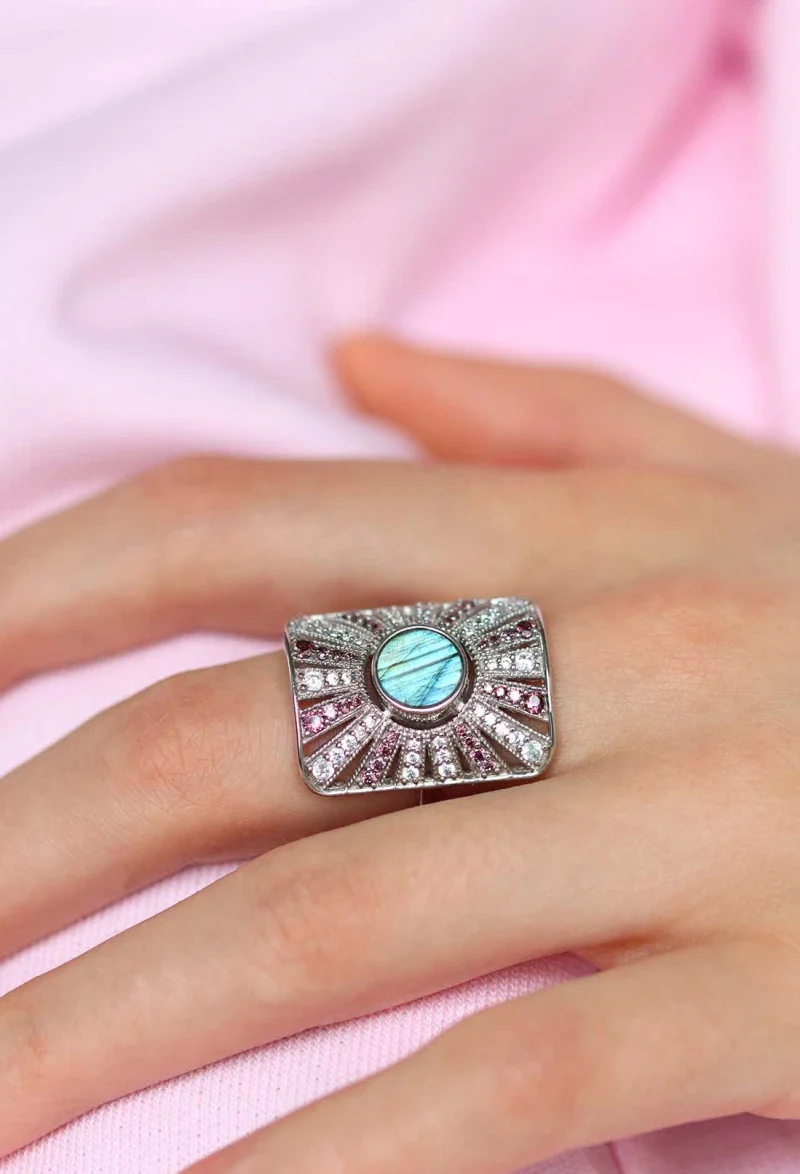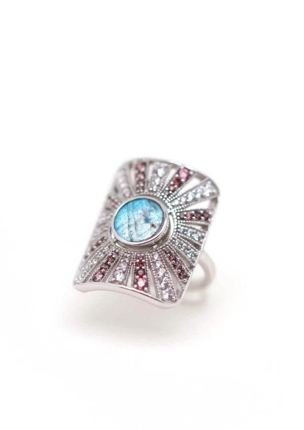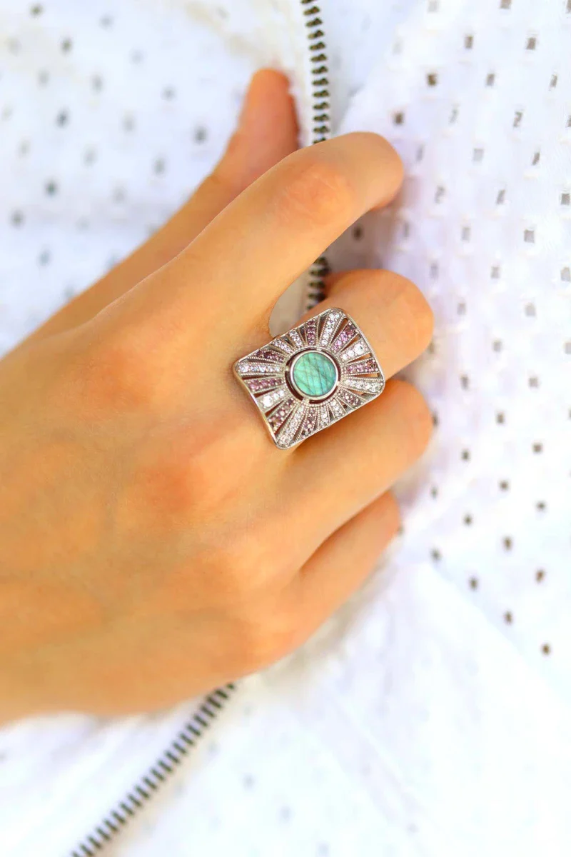 Découvrez la bague argentée et pierre labradorite Ombeline. Elle se démarque par son motif rayonnant bordé de milgrain qui lui donne sa finesse et son caractère.
