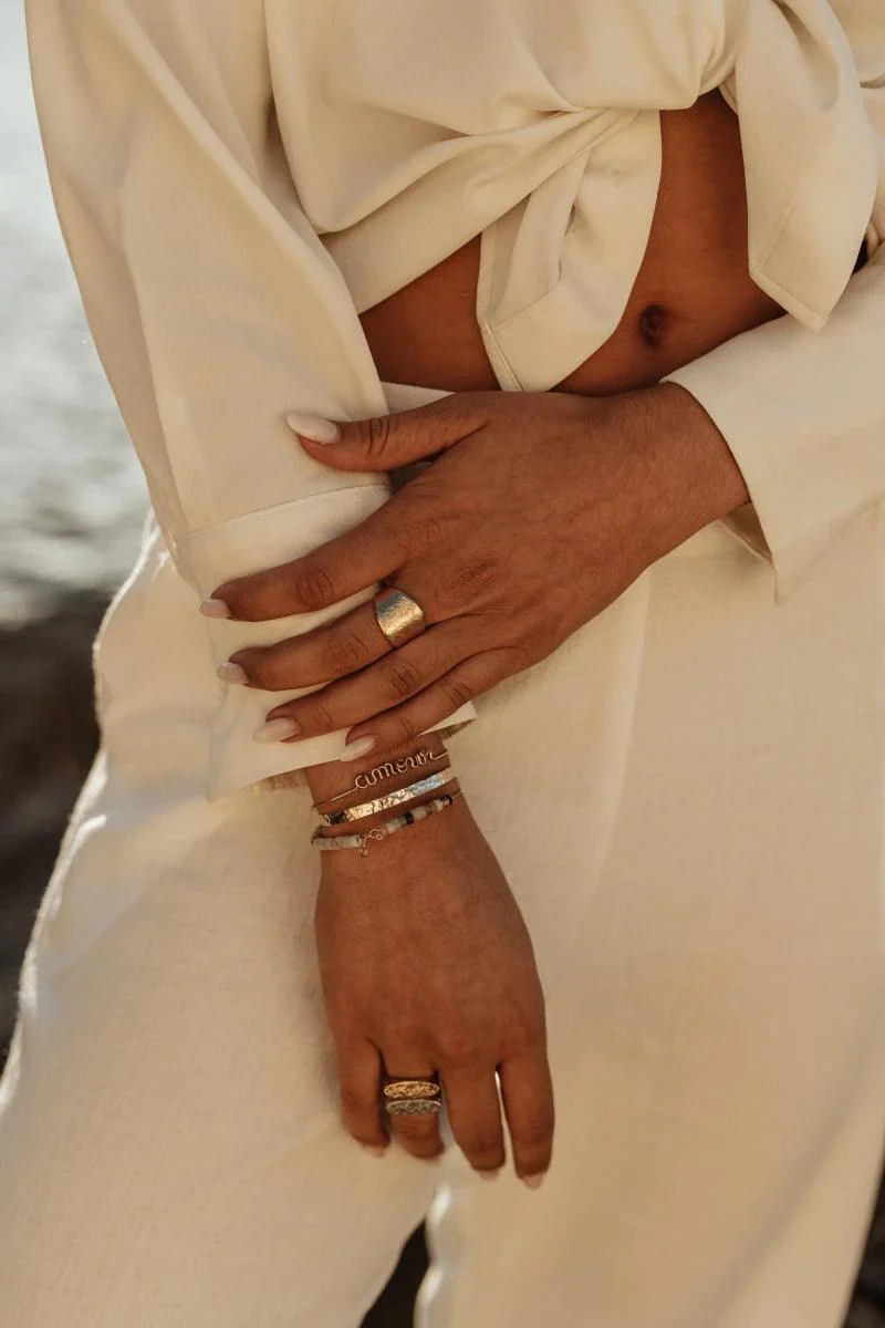 Découvrez la bague dorée Nama, fabriqué en France avec des matériaux recyclés. Cette bague est le bijou parfait pour vous suivre tous les jours sans inquiétude mais aussi parfaite comme cadeau qui allie style et praticité. Une “statement piece” qui se suffit à elle-même.