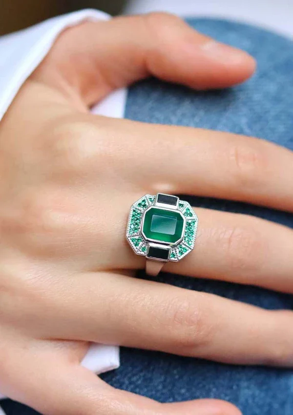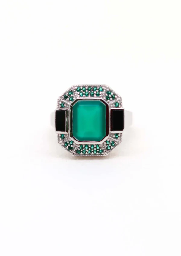 Découvrez la bague ornée d’onyx vert et noir Célestine. La bague Célestine est résolument d’inspiration Art Déco. Ses lignes graphiques et sa pierre octogonale sont caractéristiques de ce courant artistique avec son design unique.