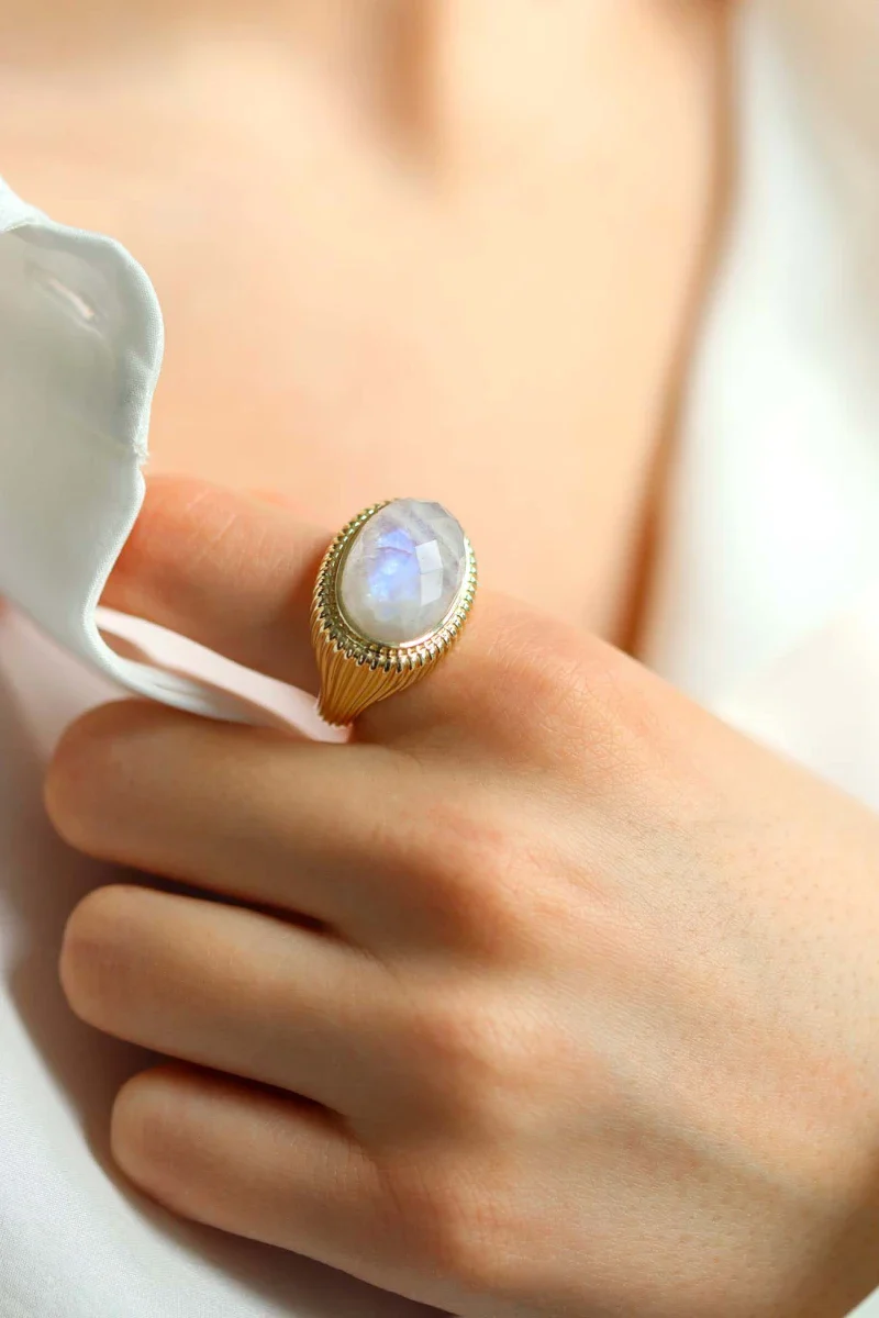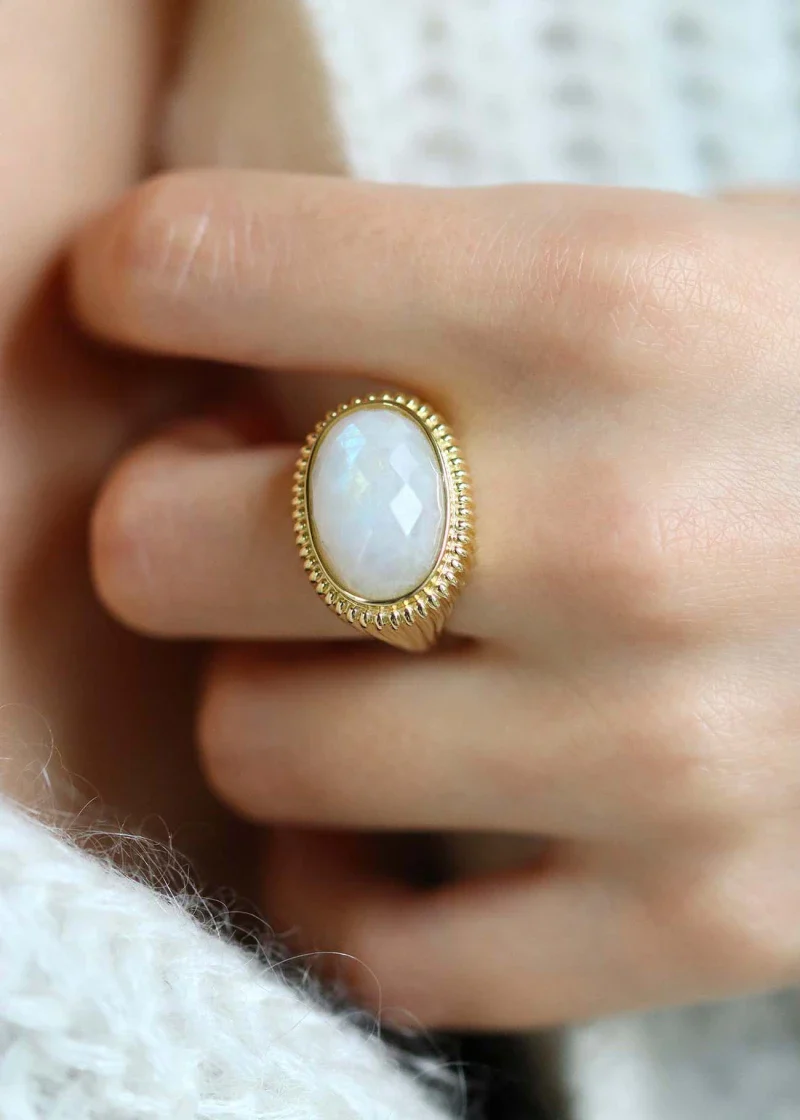 - Matériaux : Pierre de lune facettée, corps de bague avec motif godron