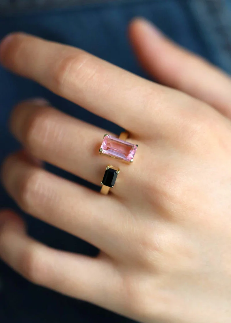 Avec son mariage entre le rose délicat du quartz rose et le noir profond de l’onyx, cette bague crée un contraste visuel fascinant qui ne manquera pas d’attirer les regards.