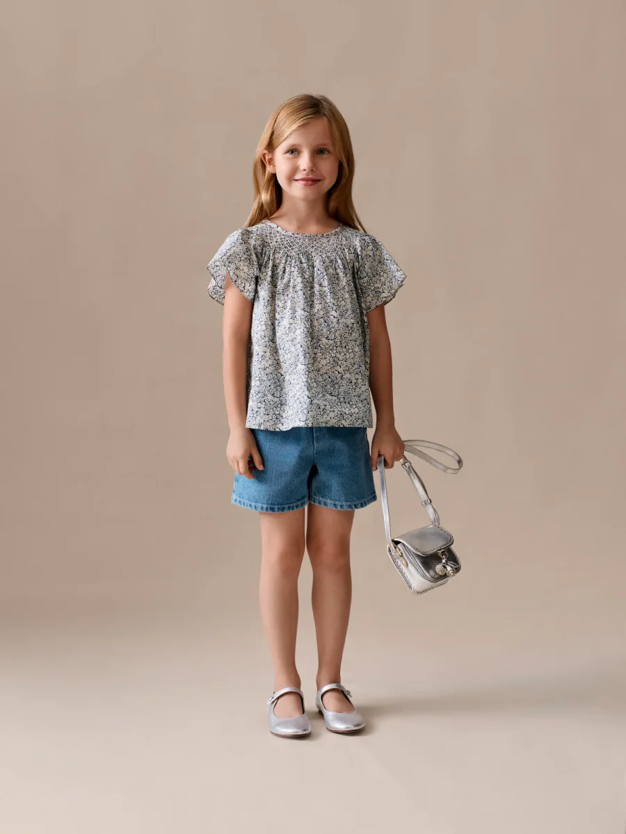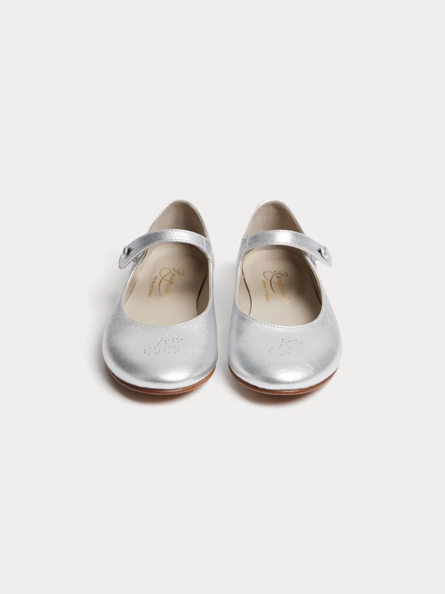 Les babies Ella sont en cuir irisé élégant. L’emblématique cerise de la Maison est perforée sur le bout rond.