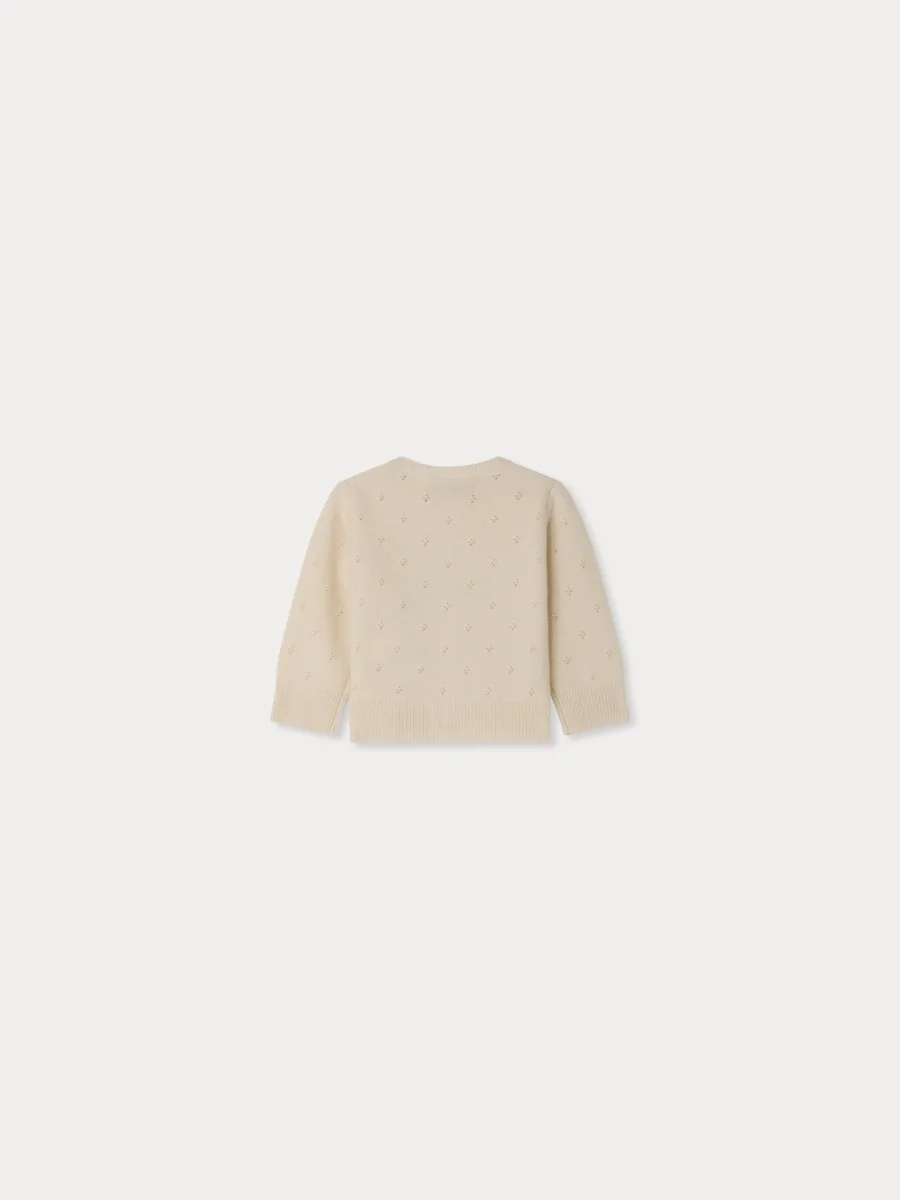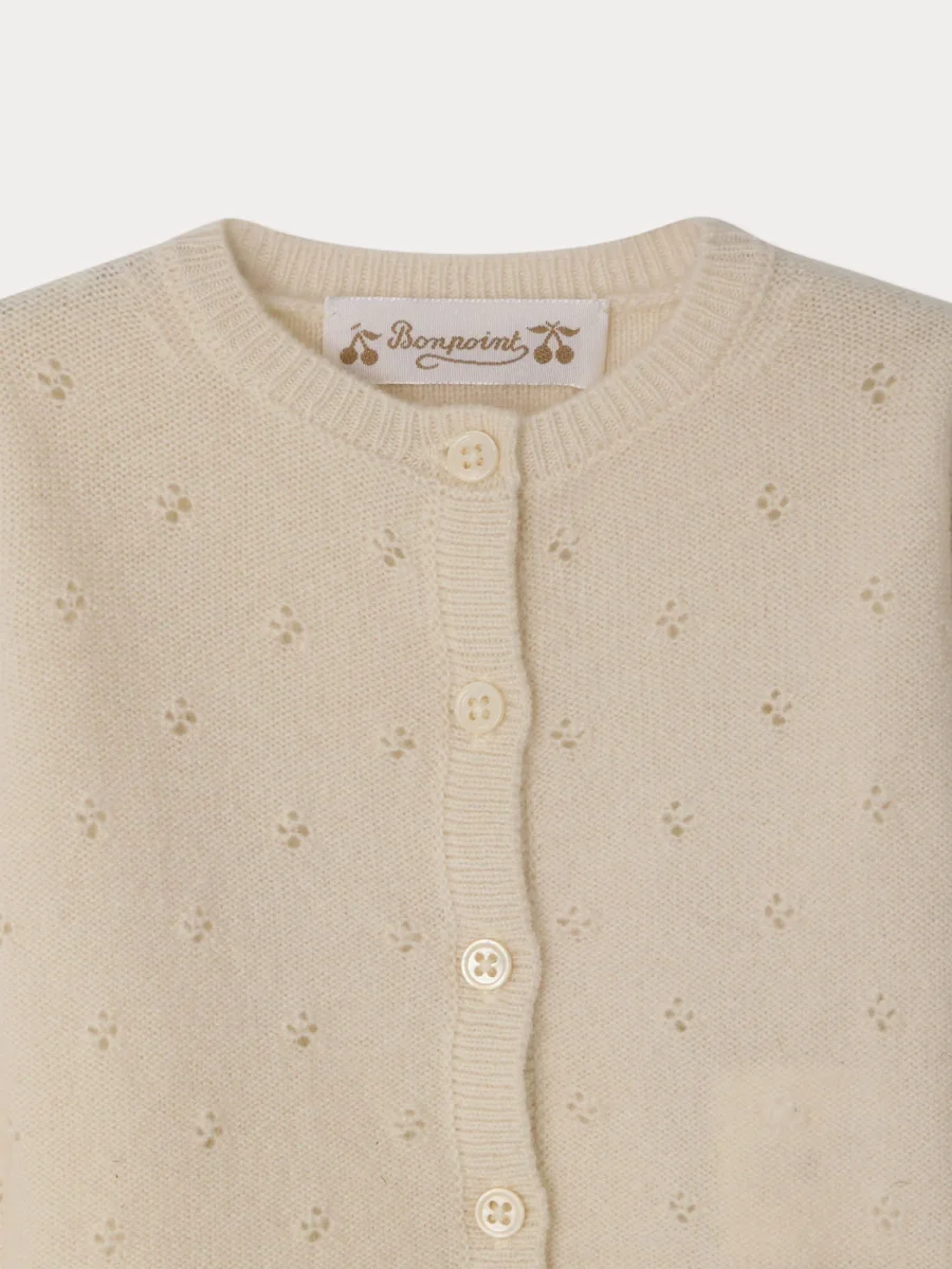 Confectionné en cachemire certifié qui garantit le bien-être animal, ce cardigan pour bébé Laelia combine chaleur, douceur et élégance. Ses motifs en maille pointelle lui confèrent tout son charme.