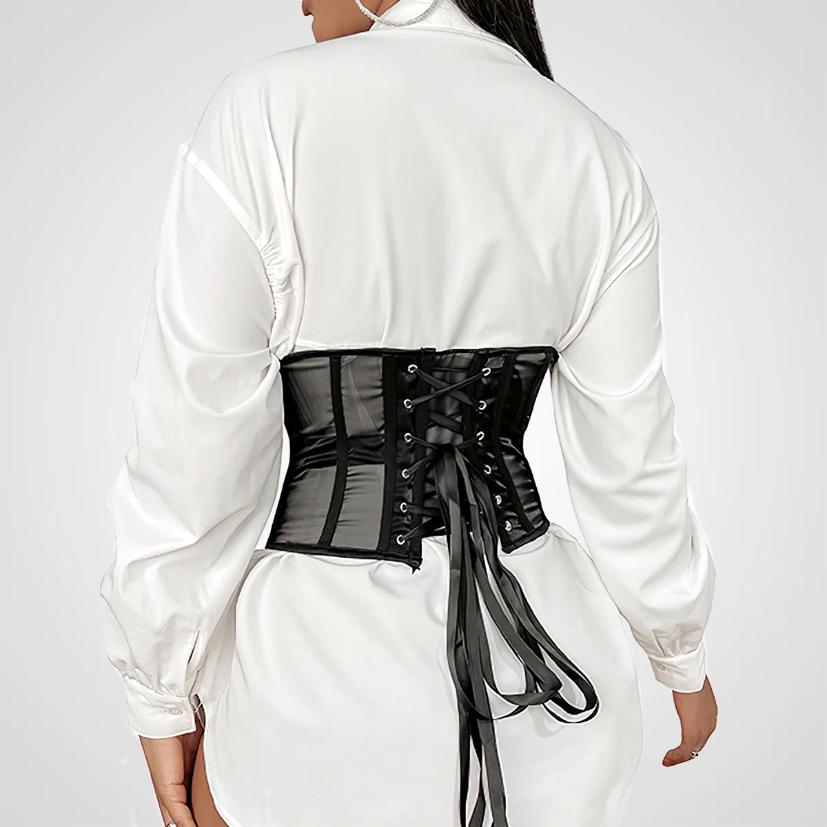 Sublimez votre silhouette avec élégance grâce à cette ceinture serre-taille corset. Sa couleur noire se marie harmonieusement avec sa transparence et vous octroiera une allure à couper le souffle. Son design présente une fermeture à glissière exposée à l’avant qui facilitera son enfilage. Au dos, son laçage vous permettra d’ajuster cette ceinture corset à votre convenance : elle épousera ainsi parfaitement les courbes de votre corps. Fabriquée soigneusement à partir de polyester et d’élasthanne, elle comporte 14 baleines souples pour vous garantir un maintien parfait. Vous pouvez la porter par-dessus une chemise blanche pour un look simple et efficace.