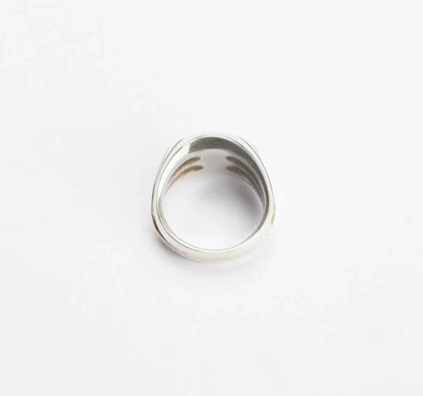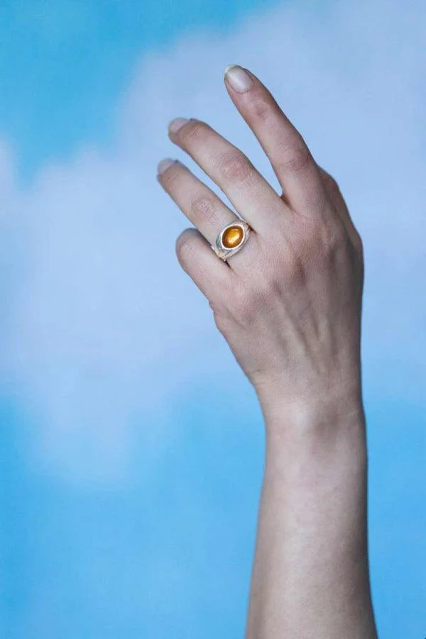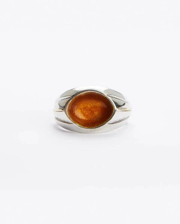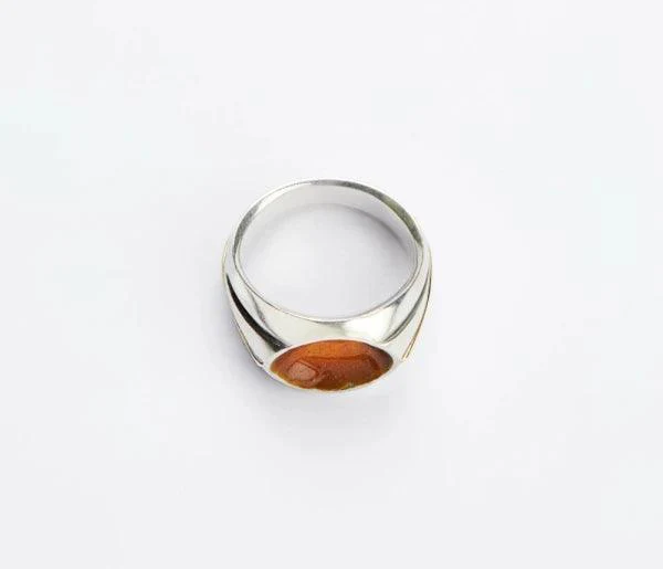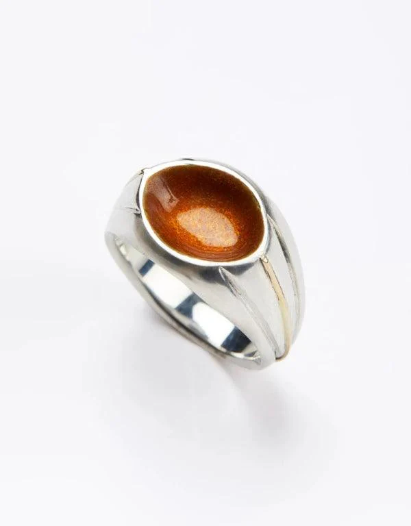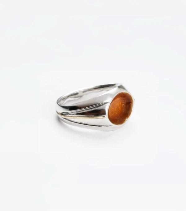 Une chevalière en argent, sublimée par un fil d’or 18 carats, met en valeur un creuset en forme d’amande, délicatement émaillé d’une teinte ambre. Cette fusion de matériaux nobles et de nuances chaleureuses offre une élégance intemporelle, capturant l’essence du luxe avec subtilité et sophistication.