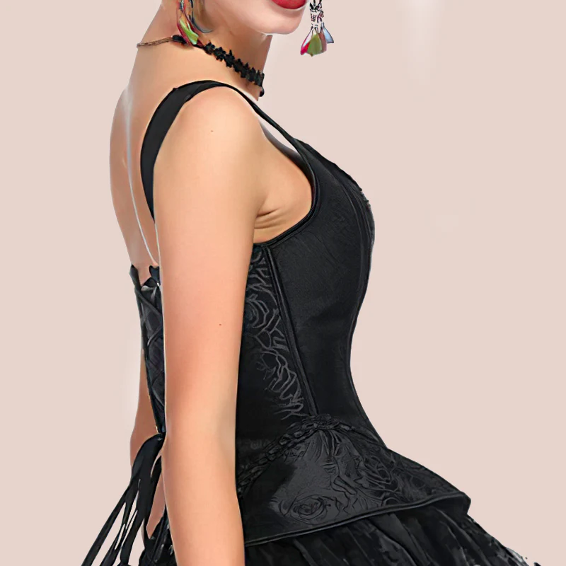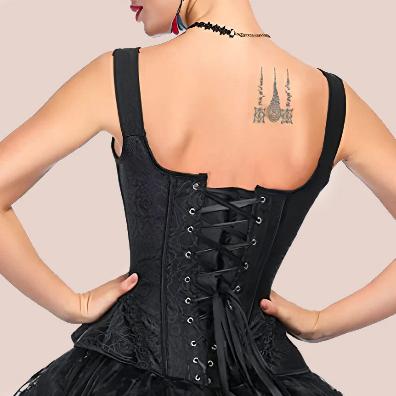 Adoptez un look sophistiqué grâce à ce corset noir avec bretelles. Subtilement décoré d’un élégant motif, sa teinte neutre vous permettra de l’incorporer facilement à votre tenue. Un busc en métal à l’avant facilite son enfilage et un laçage situé au dos vous permettra d’ajuster le serrage selon vos préférences.