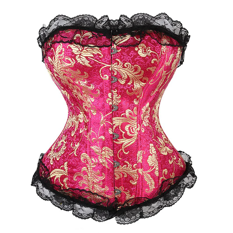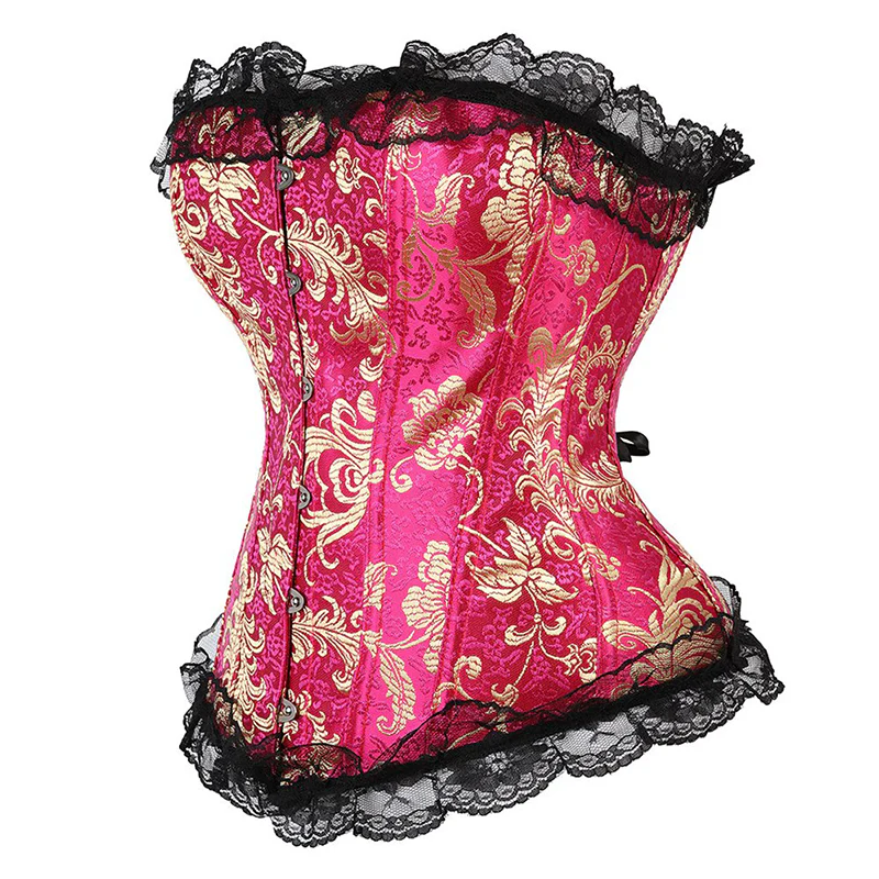 Optez pour un style vintage chic grâce à ce corset rose décoré d’un somptueux motif doré et de dentelle. Composé de baleines en plastique vous assurant maintien et confort, ce corsage dispose d’un busc en métal à l’avant facilitant son enfilage ainsi qu’un laçage au dos réglable.