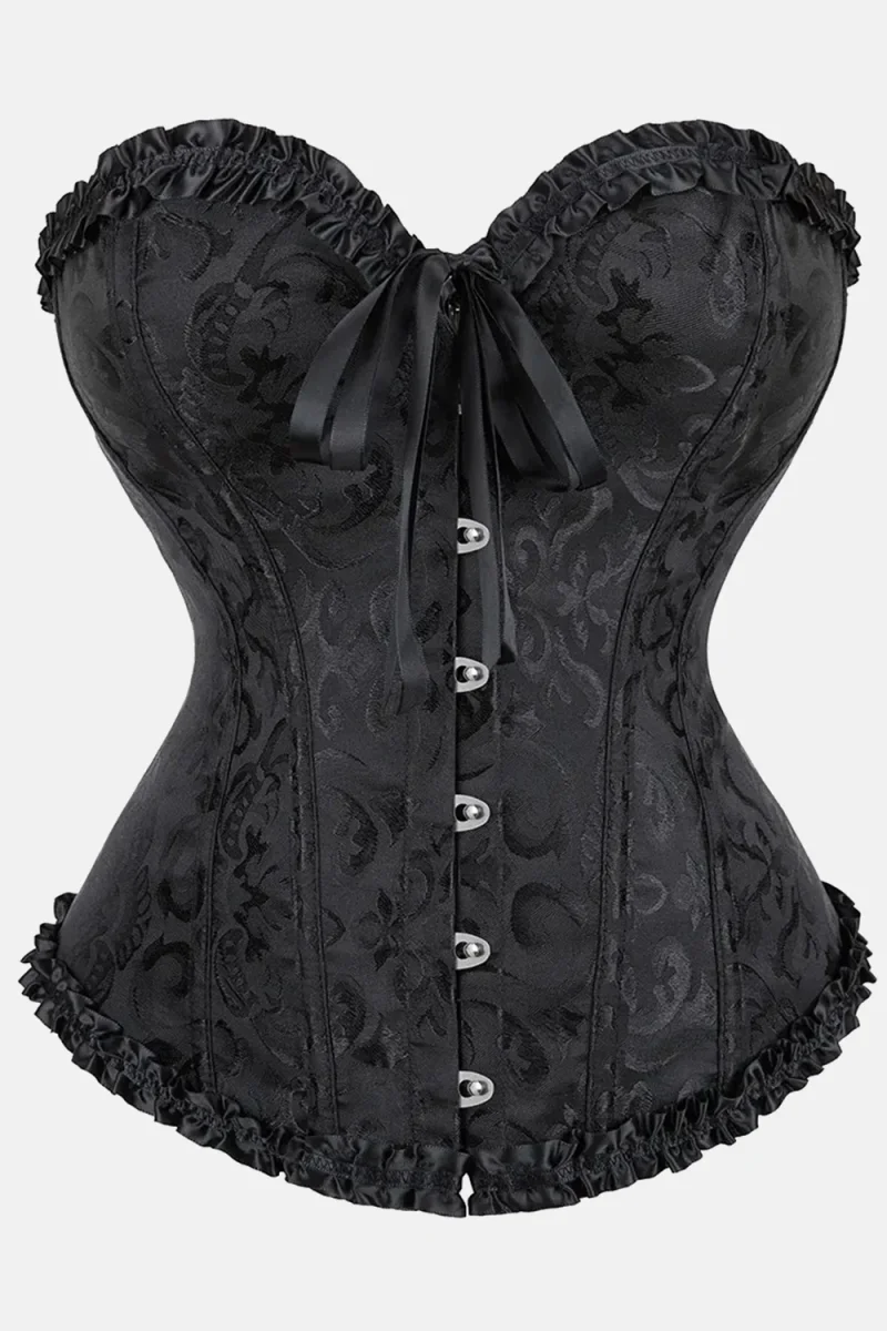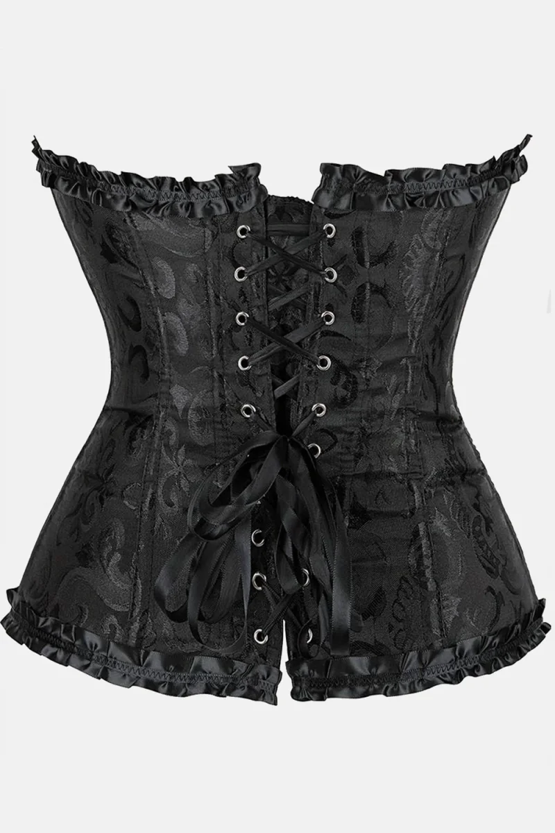 Le motif en volutes ajoute une touche de raffinement rendant ce corset parfait pour être porté comme pièce maîtresse de votre garde-robe ou sous une tenue pour une touche discrète d’élégance. Les lacets décoratifs et le laçage à rubans offrent un ajustement personnalisé tandis que le panneau de modestie garantit votre confort en toutes circonstances.