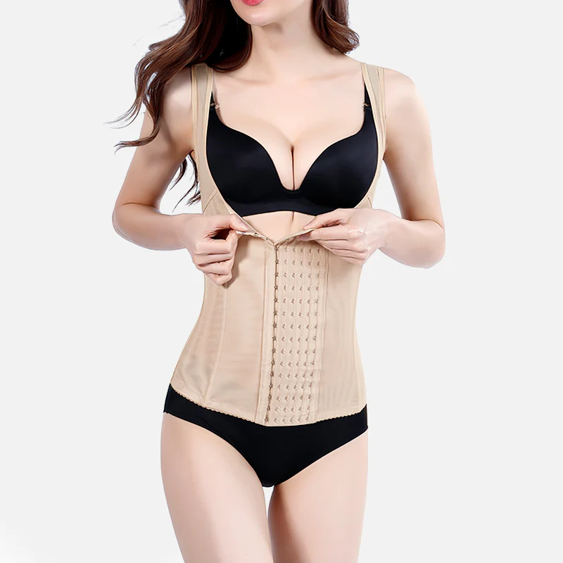 Réduisez efficacement votre tour de taille en portant ce gilet amincissant beige. Sa fermeture à crochets située à l’avant vous permettra d’ajuster la compression qu’il exerce, notamment grâce aux baleines en acier qui le composent. Ses bretelles maintiendront parfaitement votre poitrine tout en la valorisant.