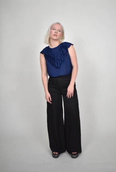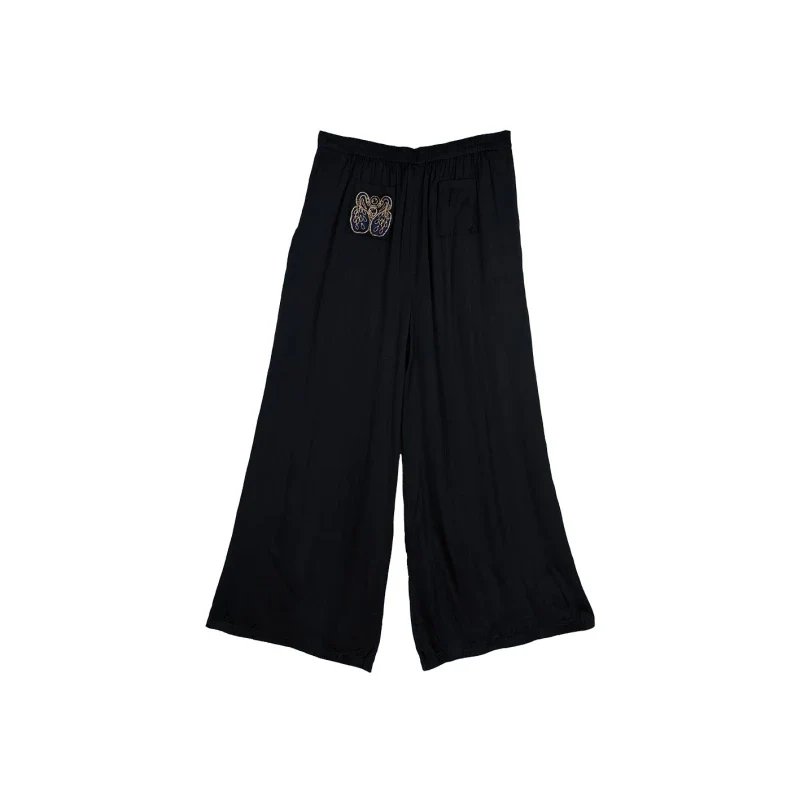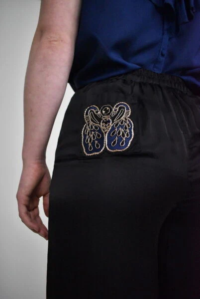 Découvrez le pantalon Elsa Black, une pièce capsule alliant innovation éco-responsable et broderie artisanale. Conçu en fibre de pétales de roses, ce modèle vegan offre un tombé fluide comparable à la soie, sans aucune matière animale. Son style intemporel se marie parfaitement avec des pièces casual ou sophistiquées.
