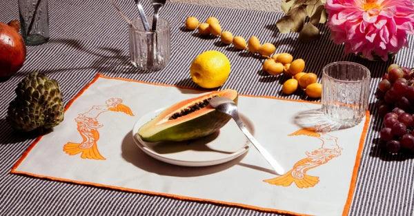 La collection de vaisselle raconte des contes étranges se déroulant sur des îles lointaines, avec des paysages de palmiers luxuriants et où de belles créatures sortent de l’eau pour nous tenter sur des rives dorées de sable.