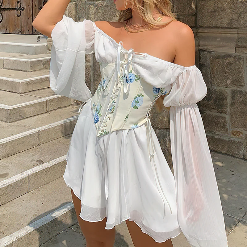Robe blanche avec corset lacé à imprimé floral
