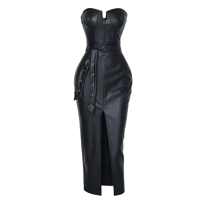 Robe bustier en cuir noire longue avec ceinture