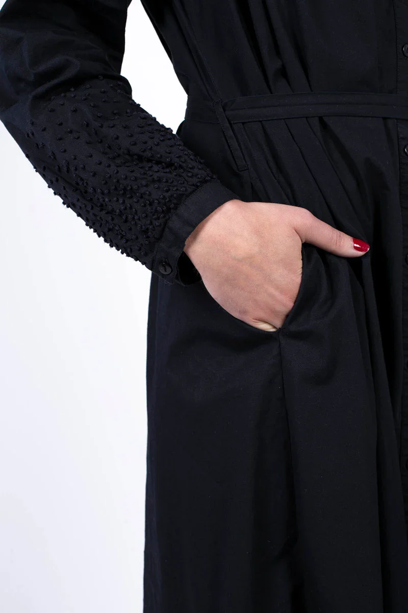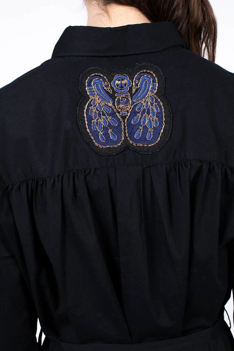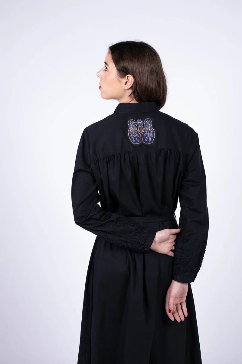 La robe Erika Black Star est une revisite engagée de la traditionnelle petite robe noire. Sa forme parfaite et sa longueur mi-mollets met en avant votre style branché. De plus, cette création LO NEEL éco-responsable est fabriquée à partir de popeline de coton bio, certifiée par le label de confiance, GOTS. La robe Erika Black Star est aussi une pépite aux milles détails : les broderies sur les manches, symbolisant des étoiles, sont réalisées à la main dans l’atelier Indien. Egalement, la broderie paons, iconique de LO NEEL, orne le dos de la robe. Pour conclure, le col retourné donne la touche créateur et stylée. Enfin elle se porte aussi bien pour vos looks de working girl ainsi que pour vos soirées d’hiver.
