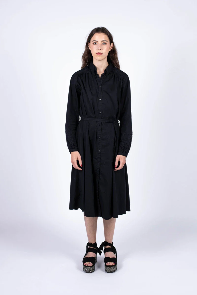 La Robe Erika Black Star est mi-mollet et peut se cintrer à la taille. Elle est fabriquée à partir de popeline de coton bio certifié GOTS. C’est la petite robe noire confortable et éco-responsable à avoir dans son dressings.