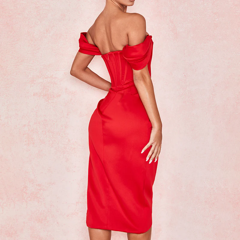 Style bustier Corset intégré Encolure bateau Jupe fendue Découvrez cette robe mi-longue rouge à corset intégré Valorisez vos courbes grâce à cette robe rouge à corset intégré. Son encolure bateau lui offre une note chic supplémentaire tout en vous gratifiant d’un décolleté sophistiqué. On apprécie notamment sa coupe mi-longue ainsi que sa jupe fendue.