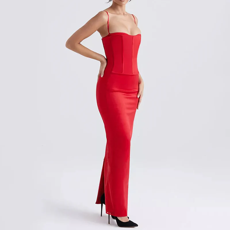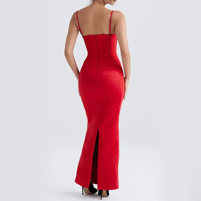 Robe corset Fines bretelles Coupe longue Fermeture à glissière Adoptez cette robe rouge corset Attirez tous les regards en portant cette robe rouge. Son style corset et sa coupe près du corps valoriseront votre silhouette. De fines bretelles maintiendront idéalement votre poitrine, et sa coupe longue rehaussera le look glamour et chic de votre tenue.