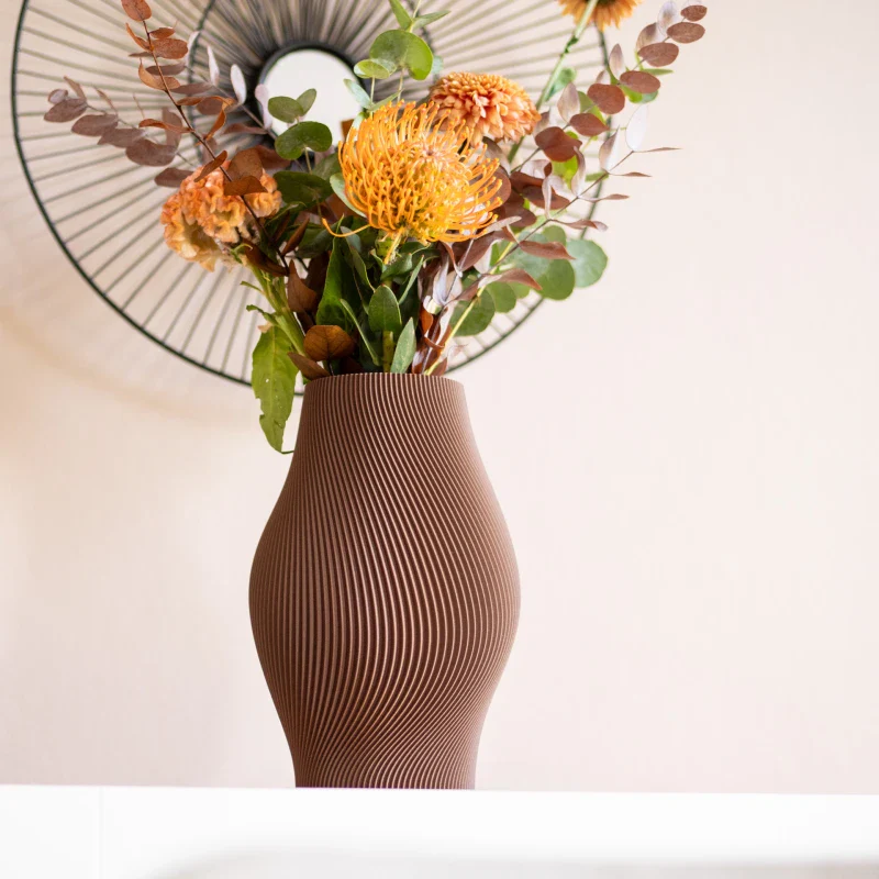 Ce vase, en bioplastique, présente une teinte terreuse chaleureuse qui s’accorde parfaitement avec des fleurs séchées ou stabilisées. Sa texture ondulée et nervurée apporte profondeur et sophistication.