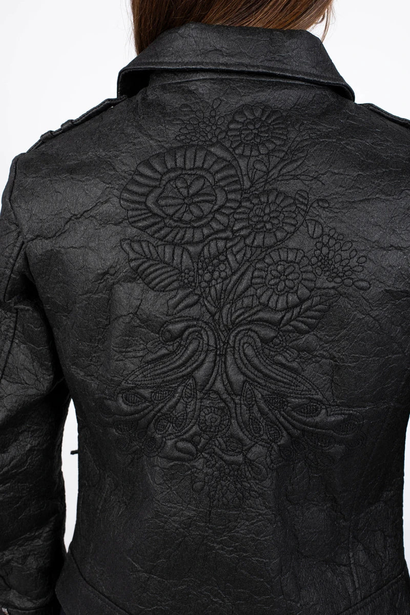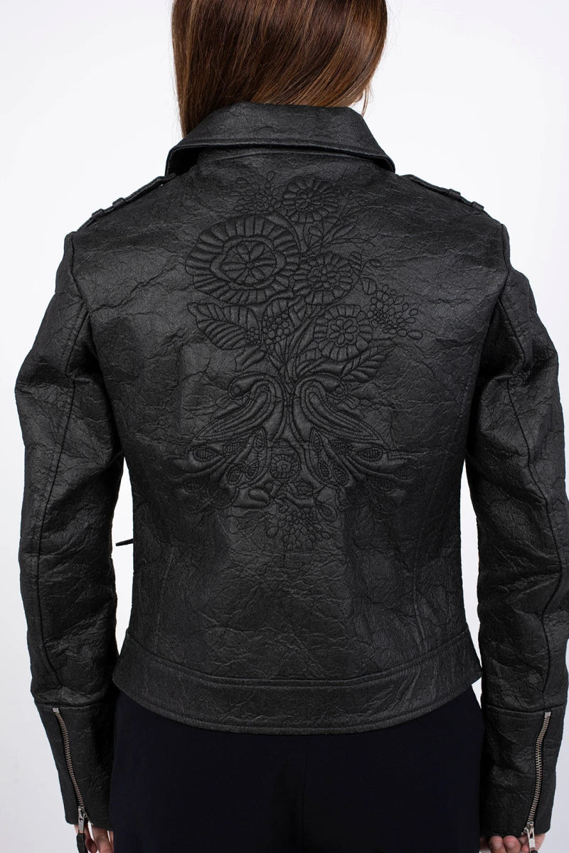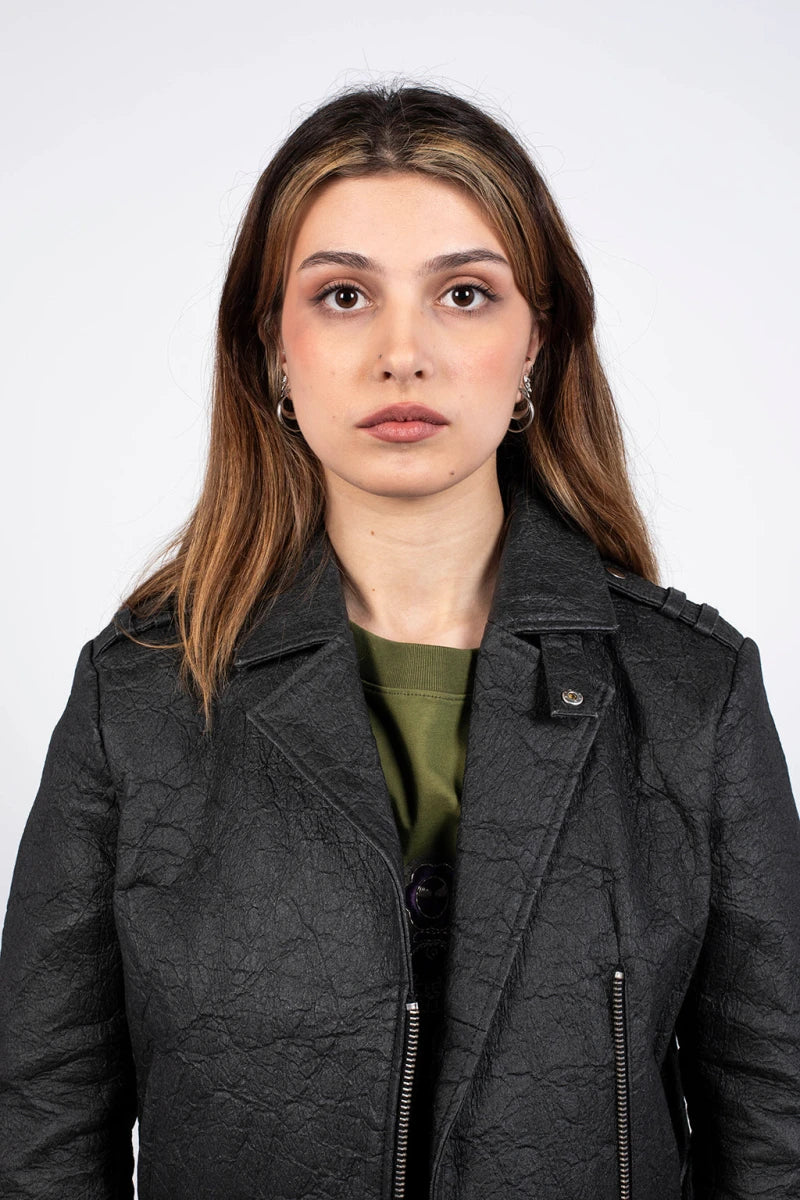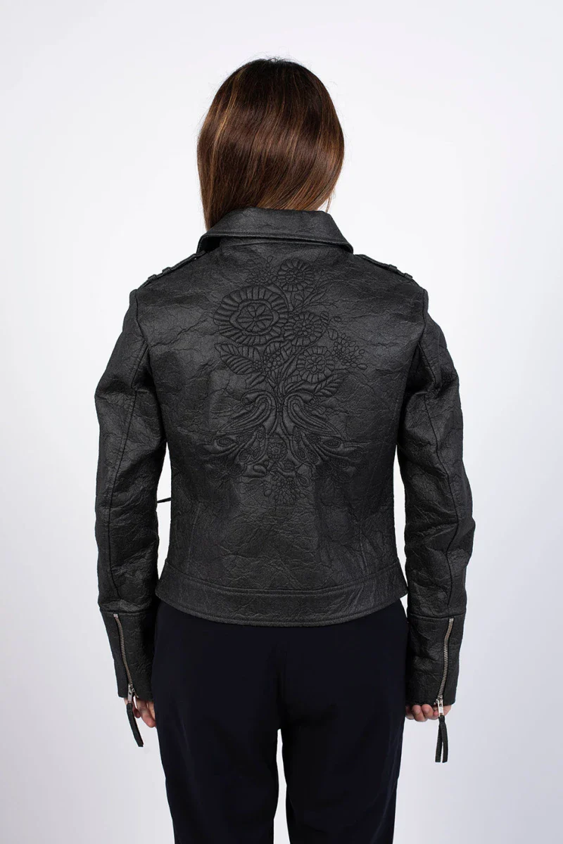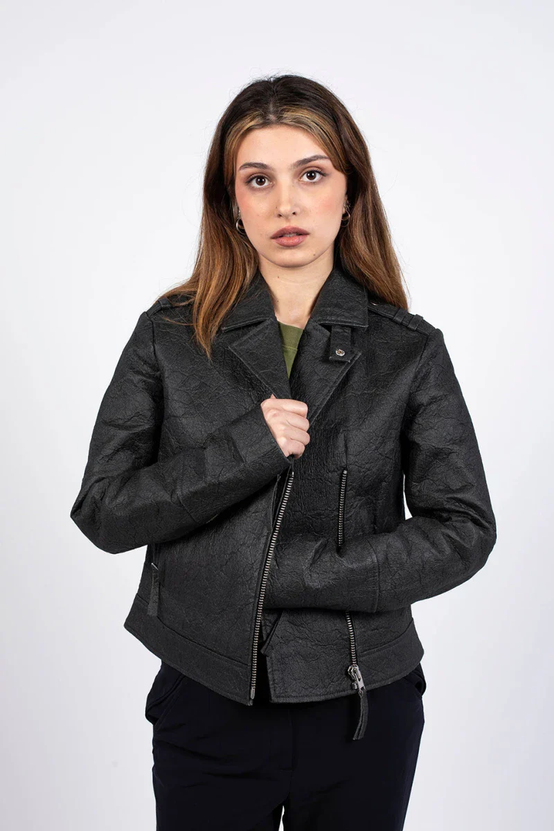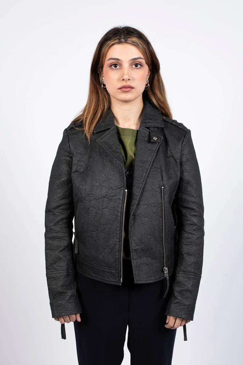 Découvrez la pièce iconique de la marque LO NEEL : une veste perfecto revisitée en fibre d’ananas Pinatex, alternative végane et innovante au cuir animal. Avec ses broderies embossées main inspirées de l’artisanat indien, cette création allie éthique et élégance pour un look urbain et responsable.