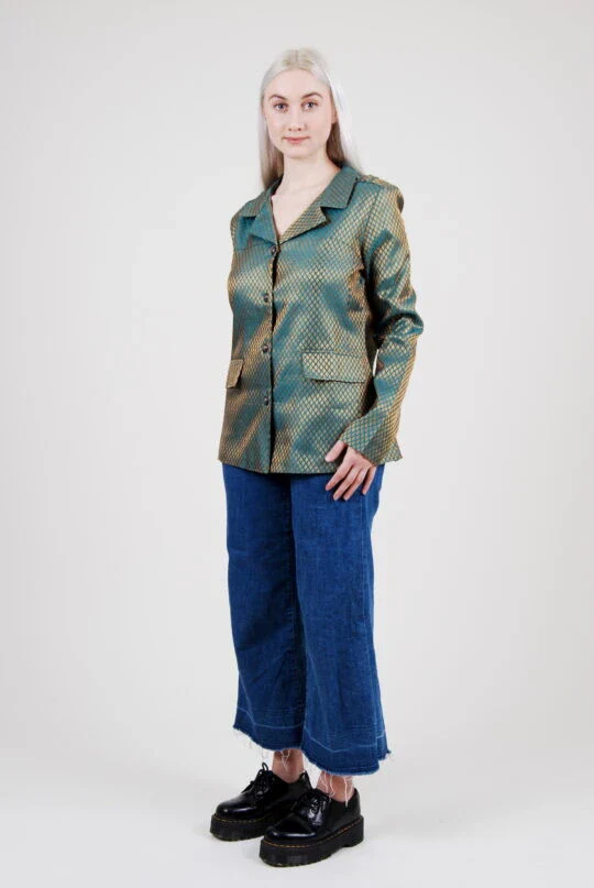 Veste vert chrome en polyester recyclé Découvrez la veste Alice, un blazer chic alliant savoir-faire artisanal et engagement écologique. Conçue dans un polyester recyclé issu de bouteilles plastiques transformées, cette pièce unique présente une broderie jacquard métallisée représentant la mythique plume de paon, symbole de LO NEEL. Son dos orné de la signature brodée main […]